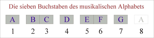 Das Noten-Alphabet kennt nur diese sieben Buchstaben, alle weiteren Noten sind lediglich Variationen dieser Grundtöne, ähnlich wie die Umlaute (ä, ö und ü) Variationen der Buchstaben (a, o und u) sind.