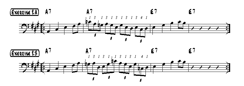 Die beiden Fills unterscheiden sich vor allen Dingen dadurch, dass sie zu unterschiedlichen Akkorden hinführen sollen: Fill 1 leitet zur Subdominante (hier D7), während Fill 2 zur Dominante (E7) hinleitet.